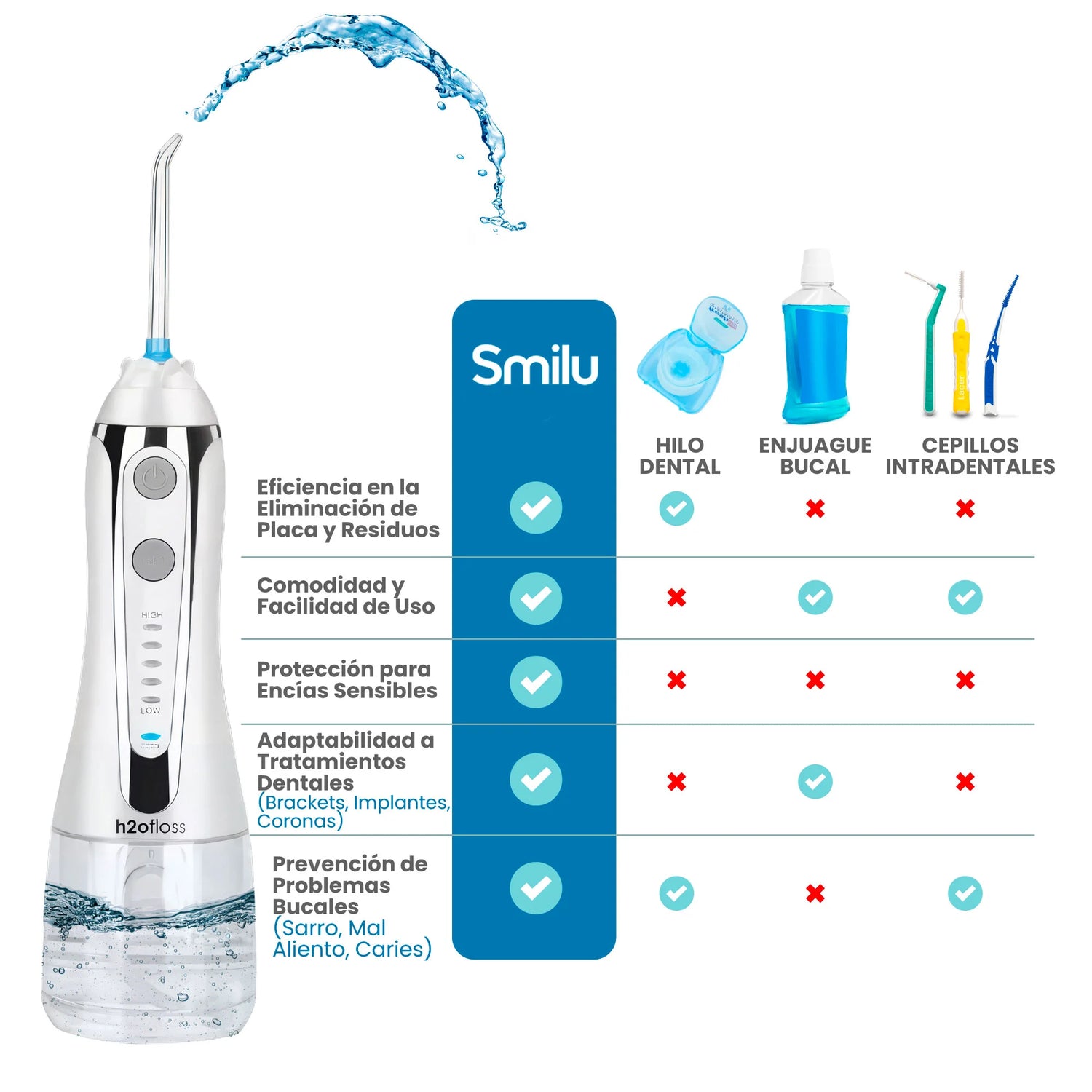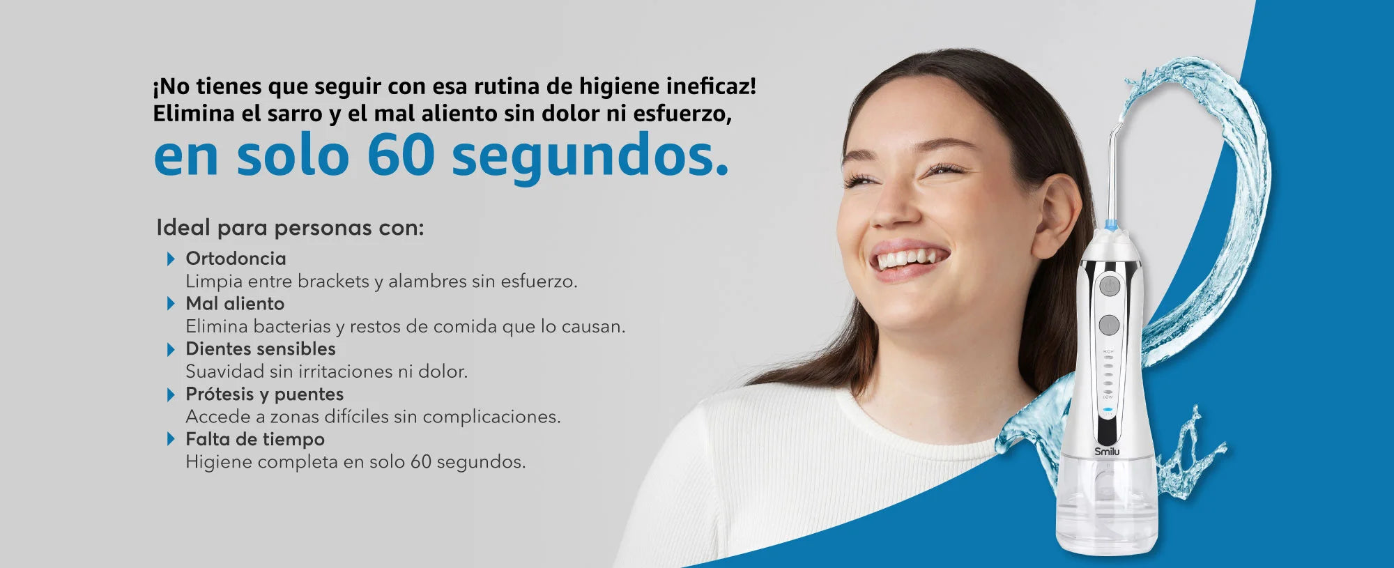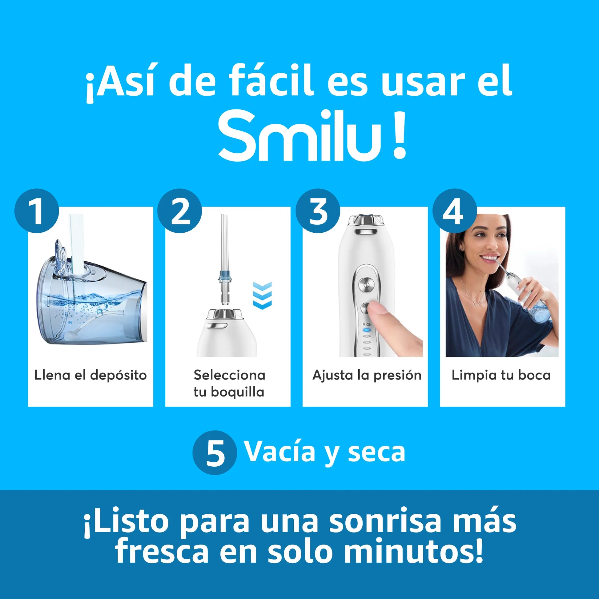 Olvídate del hilo dental incómodo y los enjuagues ineficaces. Con SMILU, eliminas el sarro, el mal aliento y las bacterias de forma rápida, profunda y sin dolor. ¡Limpieza profesional en casa en solo segundos!