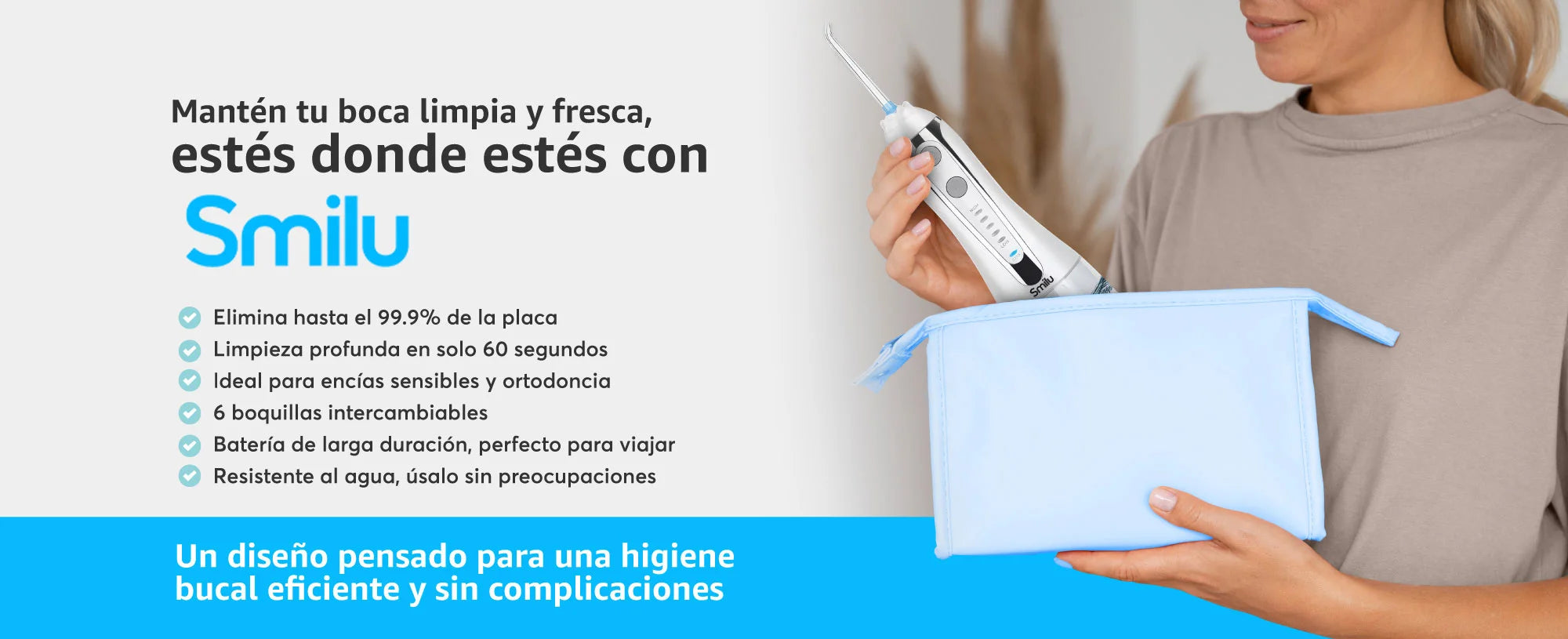 En SMILU, entendemos lo frustrante que puede ser lidiar con mal aliento, encías sensibles o la incomodidad de la ortodoncia y prótesis dentales. Por eso, hemos creado un irrigador dental diseñado para ofrecerte una limpieza profunda, cómoda y efectiva en solo segundos.